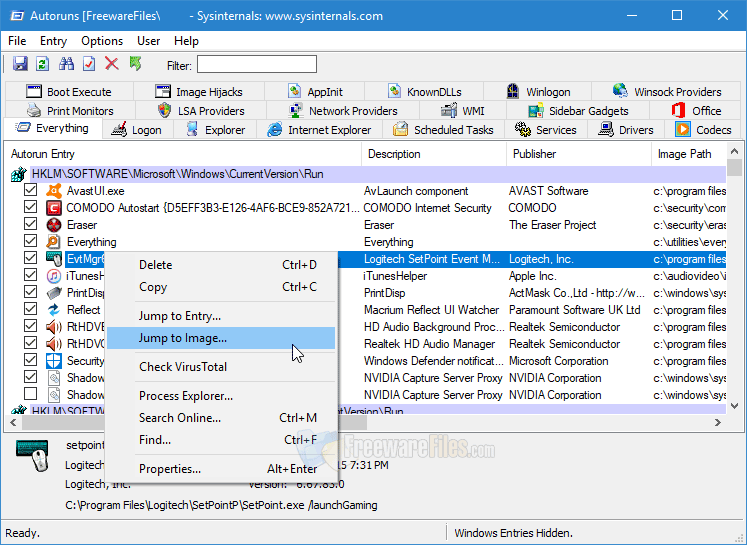 We found it easy to identify sections with errors, as Autoruns marked them in a different color. Clicking on an entry displayed details of the application on the lower part of the program window, including application name, size, time, version and full path. Right-clicking displayed a context menu that gave us the option to delete, copy, jump to entry, jump to image, search online, process explorer or check properties.